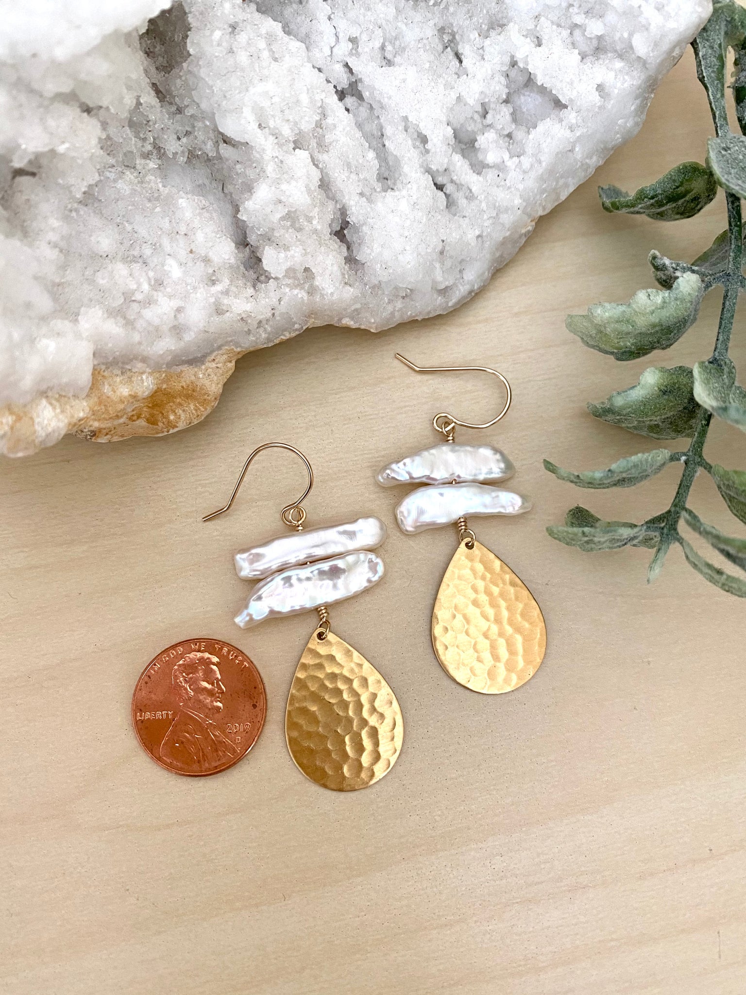 Gorgeous freshwater pearls paired with a hammer and textured gold drop. These earrings are suspended from 14K gold filled ear wires. The stick pearls have lovely lustre and shine, as do the hammered and textured gold drops. These earrings are fairly lightweight and measure approximately 2.5 inches from the top of the ear wires.